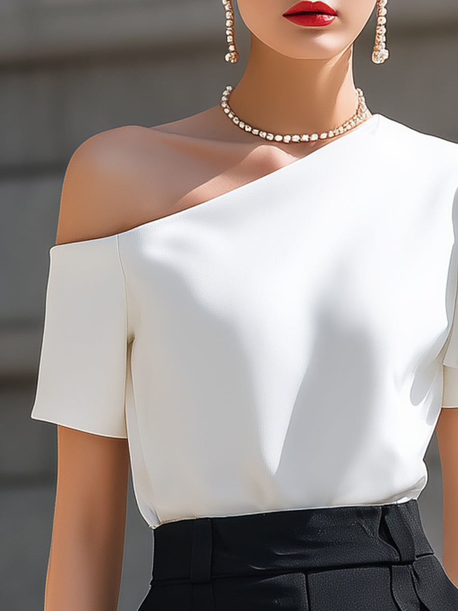 This elegant one-shoulder blouse blends modern sophistication with feminine charm, creating a refined statement piece for both professional and social occasions. Designed with a stylish asymmetric neckline, the blouse gracefully reveals one shoulder while maintaining a polished and contemporary silhouette. The standout feature is the delicate layered ruffle sleeve on one side, which adds dimension, texture, and soft movement to the overall design.