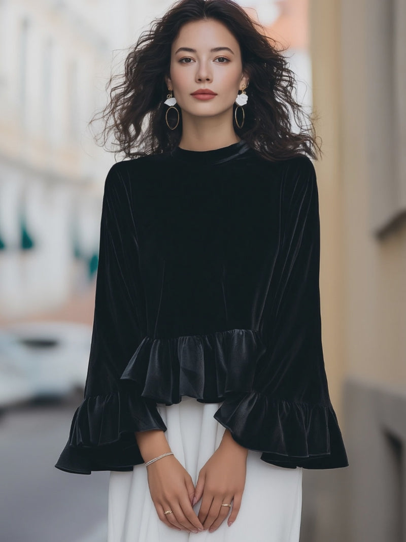 Statement ruffle trims highlight the hem and the wide bell sleeves, adding graceful movement and a feminine flourish with every step. Designed to pair seamlessly with tailored trousers or flowing skirts, this top is ideal for evenings out, special gatherings, or elevated everyday styling.