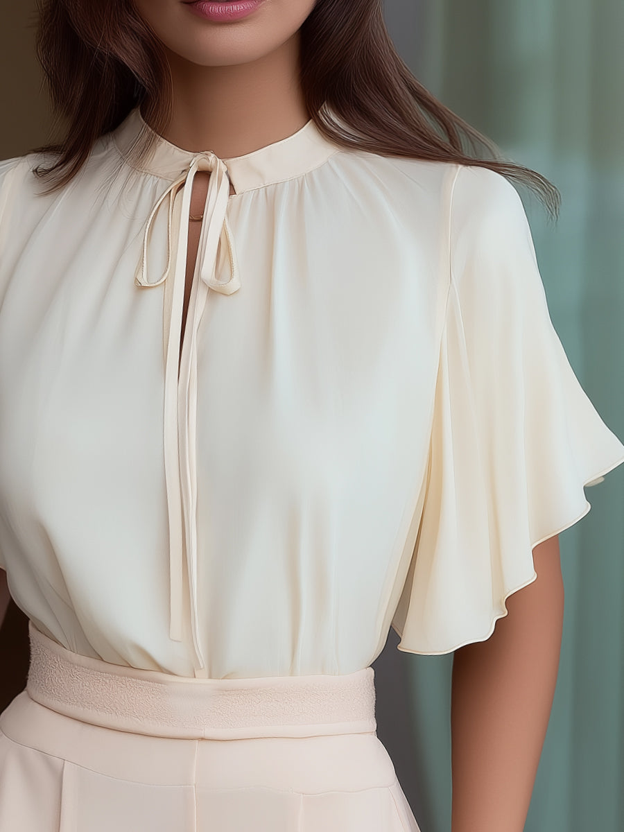Tie-Neck Flutter Sleeve Elegant Blouse