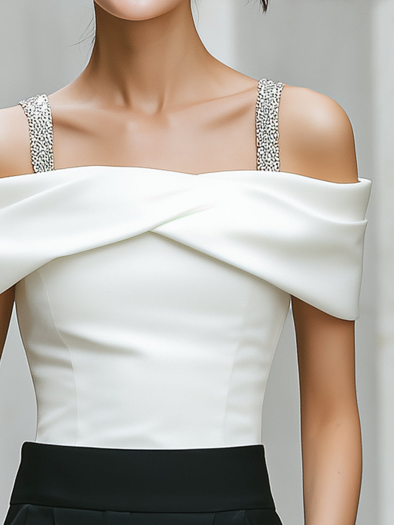 Elegant White Off-Shoulder Camisole Top With Silver Strap Detail