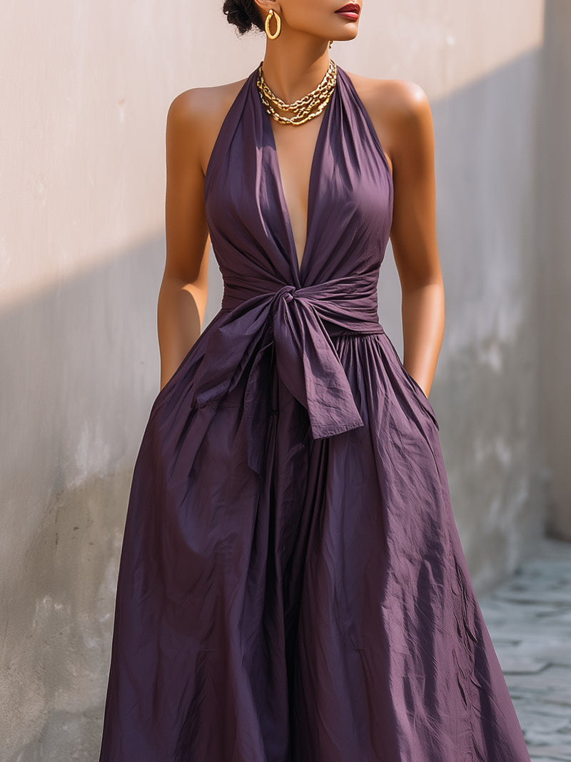 Halter Deep V-Neck Tie-Waist Maxi Dress