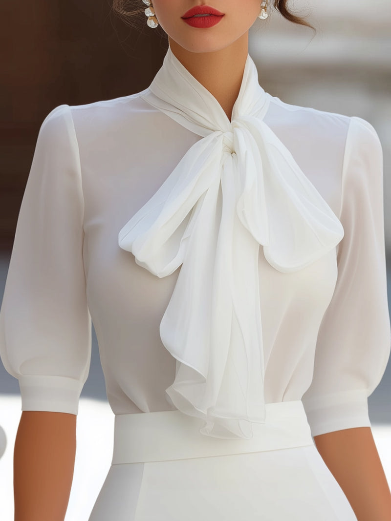 Bow-Tie Neck Blouse And Tailored Mini Skirt Set