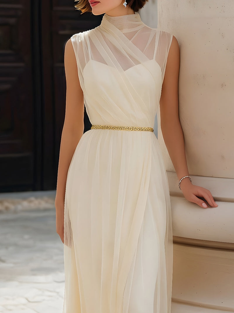 Illusion High-Neck Draped Mesh Maxi Dress