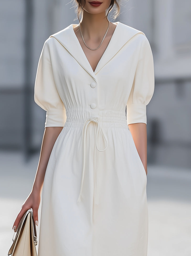 Puff Sleeve Sailor Collar Smocked Waist Midi Dress With Pockets