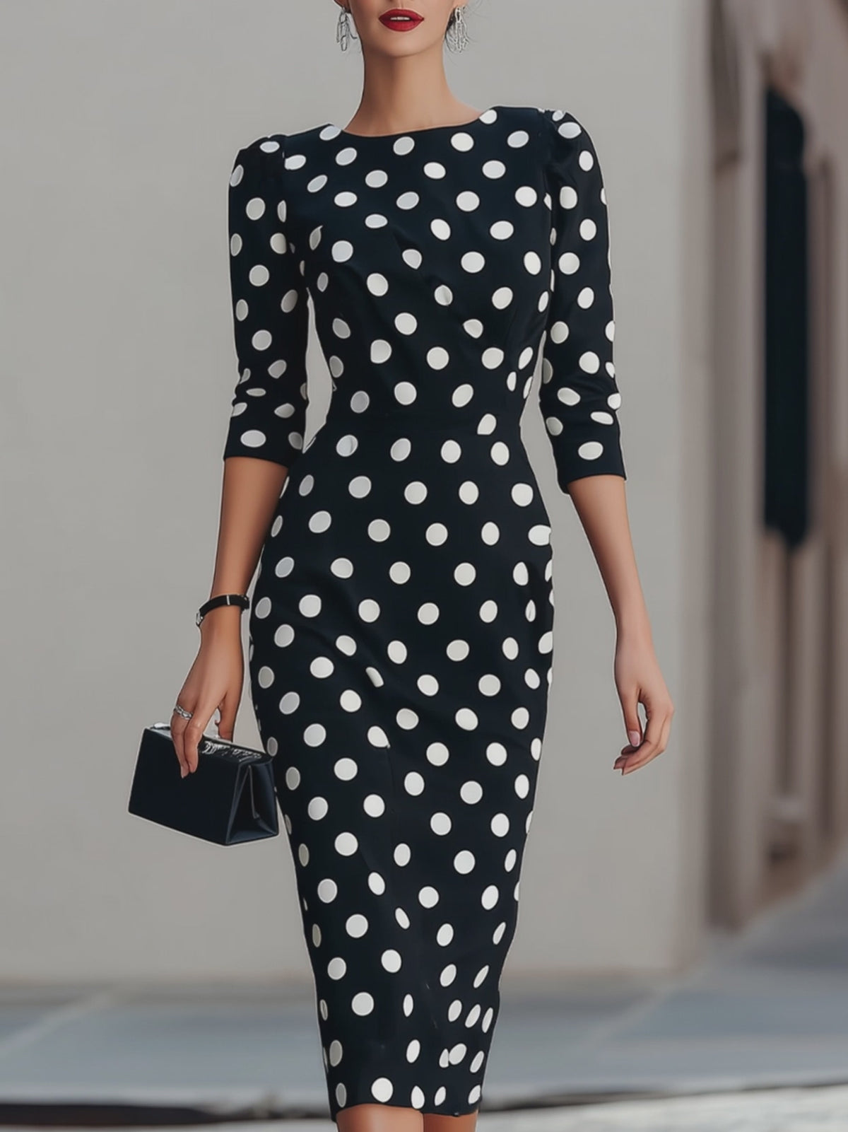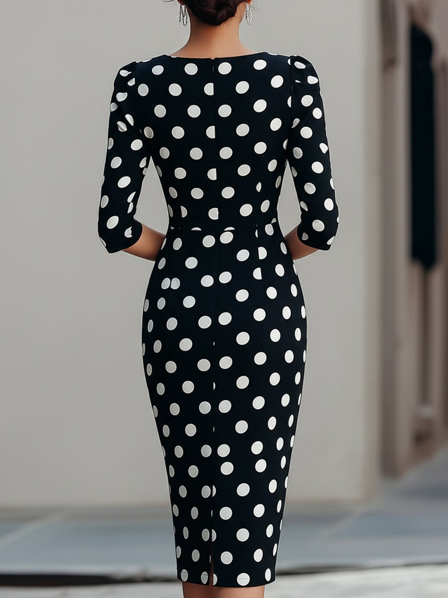Step into timeless vintage-inspired style with this Black & White Polka Dot Midi Sheath Dress from Mooyius, designed for the woman who loves to blend retro charm with contemporary sophistication. It features a classic crew neck, three-quarter length sleeves with subtle puff detailing, and a tailored sheath silhouette that skims your curves, finishing at a polished midi length.