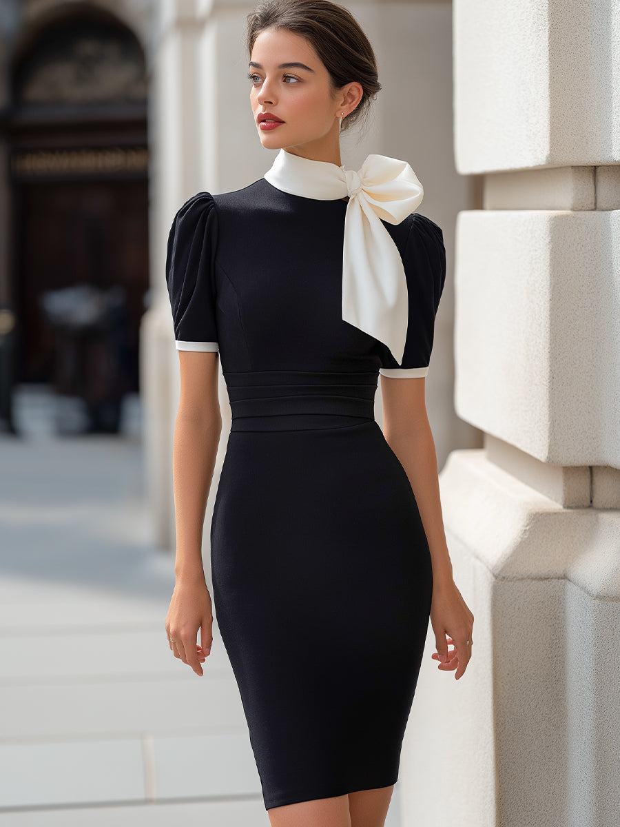 Contrast Bow Neck Puff Sleeve Pencil Dress