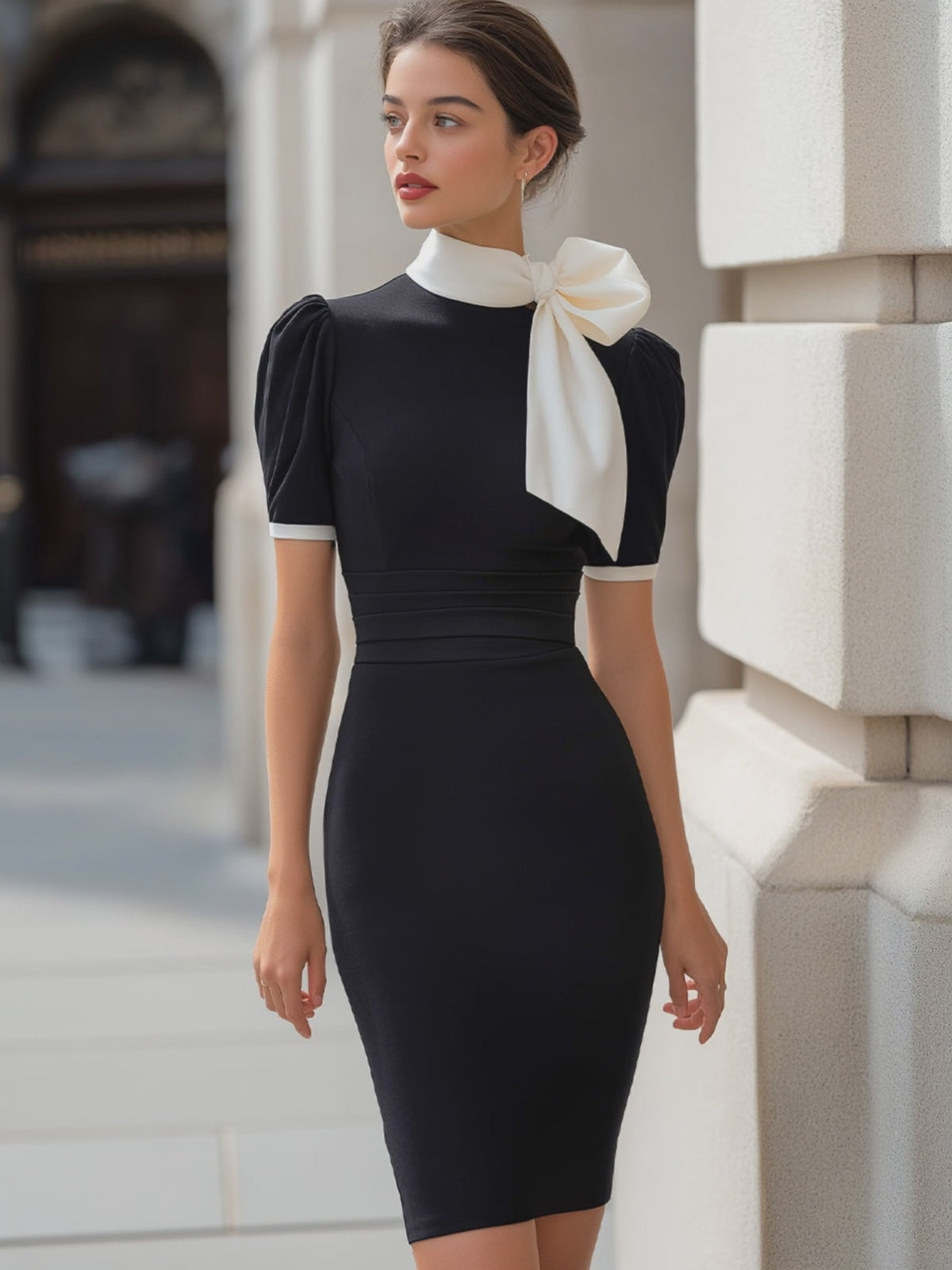 This refined pencil dress is designed to balance classic elegance with a modern, polished silhouette. Featuring a high neckline accented by a contrasting oversized bow, the design draws attention upward, framing the face with a sophisticated, couture-inspired detail. The bow drapes softly to one side, adding visual interest while maintaining a clean, tailored aesthetic suitable for professional and formal settings.
