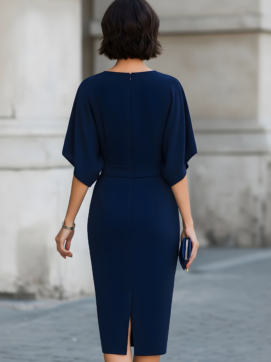 Elegant Navy Blue Batwing Sleeve Midi Sheath Dress