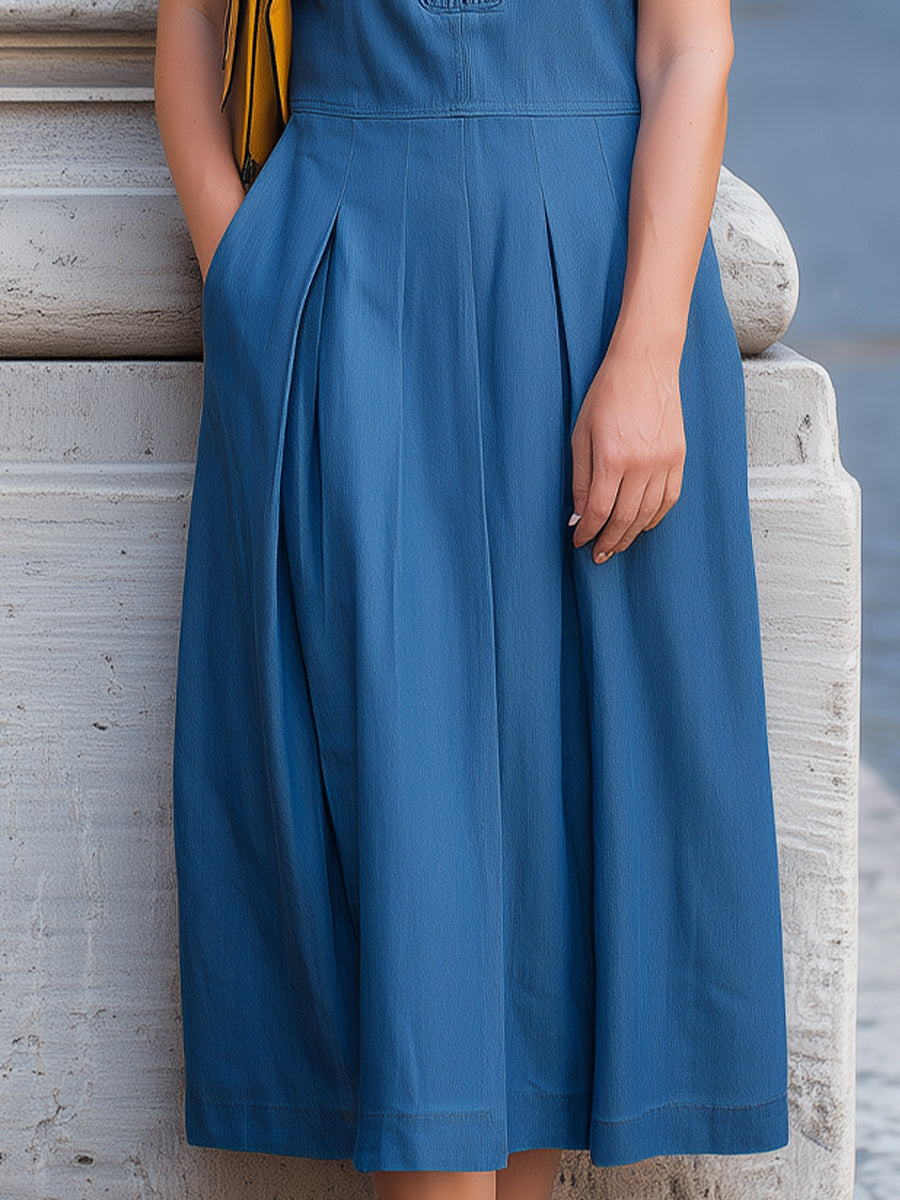 Effortlessly blending timeless sophistication with modern ease, this sleeveless midi dress is a versatile staple for the contemporary wardrobe. Crafted in a stunning shade of slate blue, the dress features a unique tuxedo-style pleated bib at the chest, adding a touch of structured elegance to the bodice. The waist is precisely tailored to transition into a voluminous A-line skirt, enhanced by deep box pleats that provide beautiful movement and a flattering silhouette.