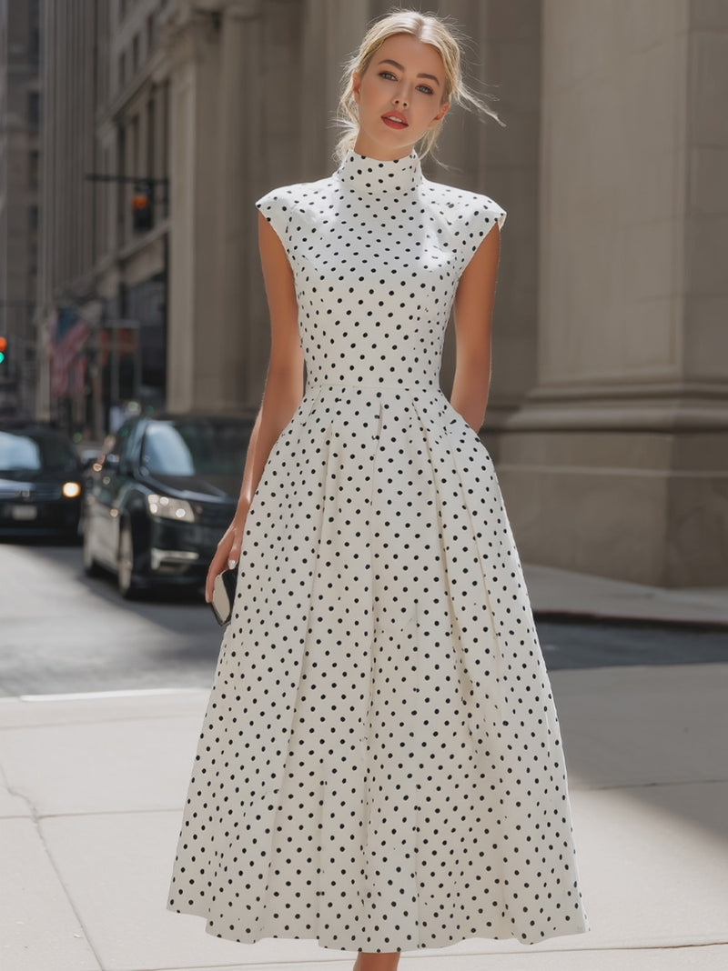 Vintage Polka Dot Mock Neck Cap-Sleeve Midi Dress