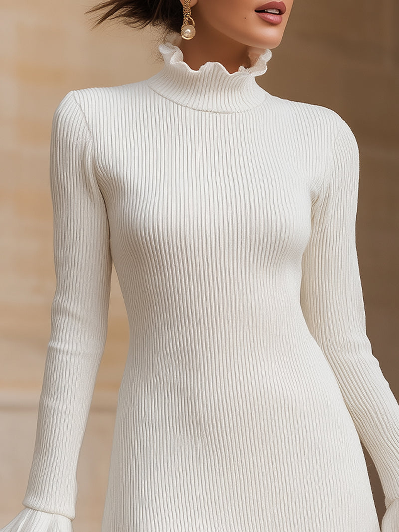 Ribbed Knit Ruffle Trim Mock Neck Mini Dress