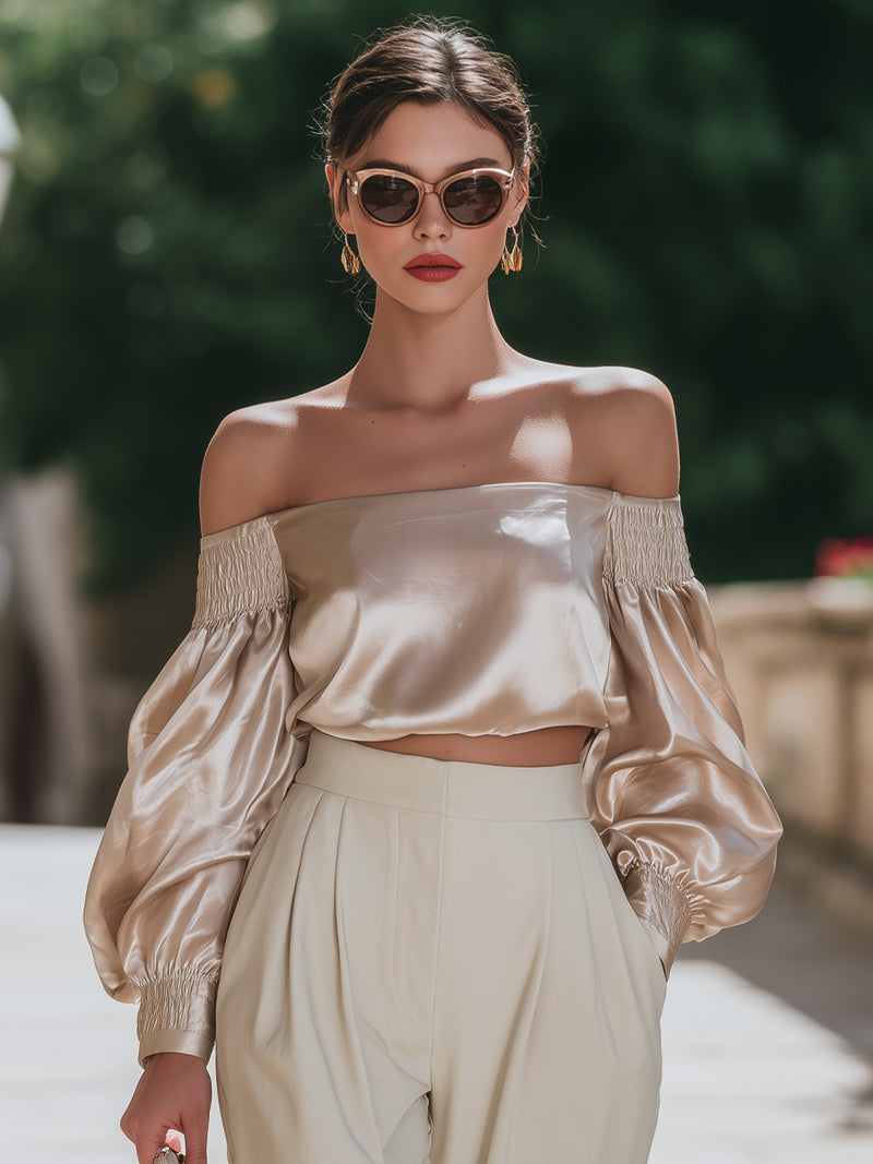 Silk-Feel Off-Shoulder Blouse With Smocked Sleeves