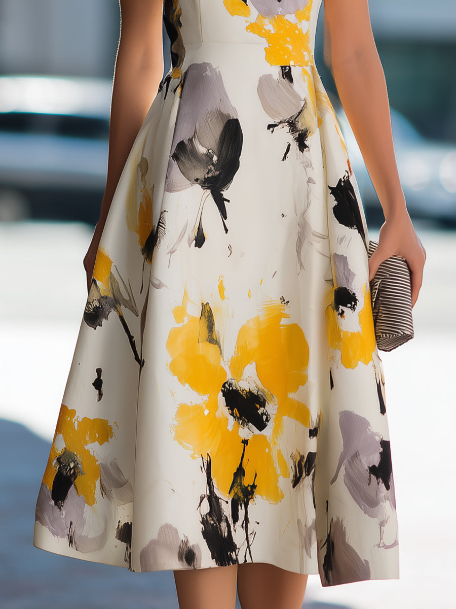 - Design: Sleeveless silhouette, round neckline, artistic abstract floral print, fitted bodice, defined waistline, flowing A-line midi skirt