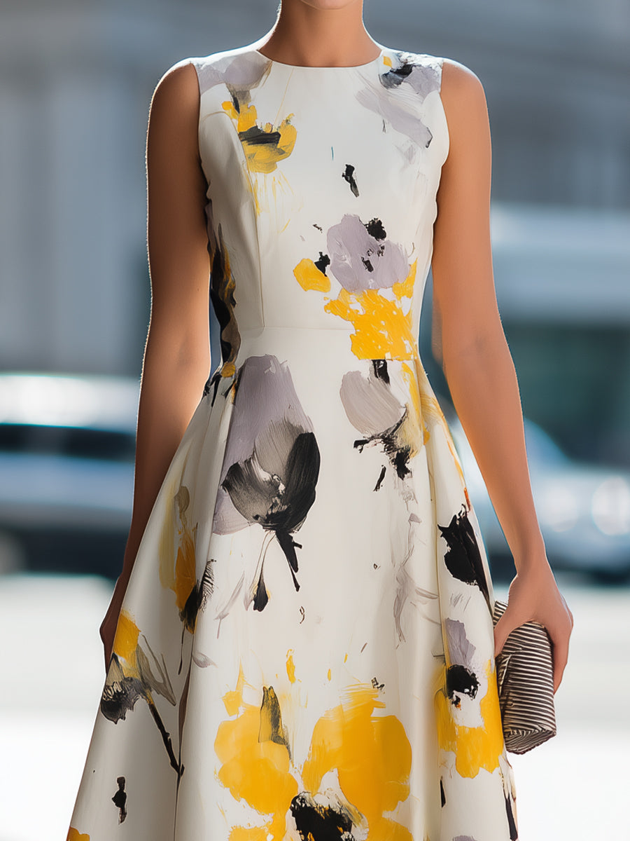 Mooyius presents a refined midi dress that blends artistic expression with timeless feminine tailoring. This elegant sleeveless design features a clean round neckline that frames the shoulders with effortless sophistication while maintaining a polished and modern aesthetic. The bodice is tailored with precision to create a smooth, structured silhouette that gently defines the natural waistline, offering a flattering and balanced profile. Flowing from the waist, the skirt opens into a graceful A-line shape that moves naturally with every step, creating soft volume and fluid elegance.