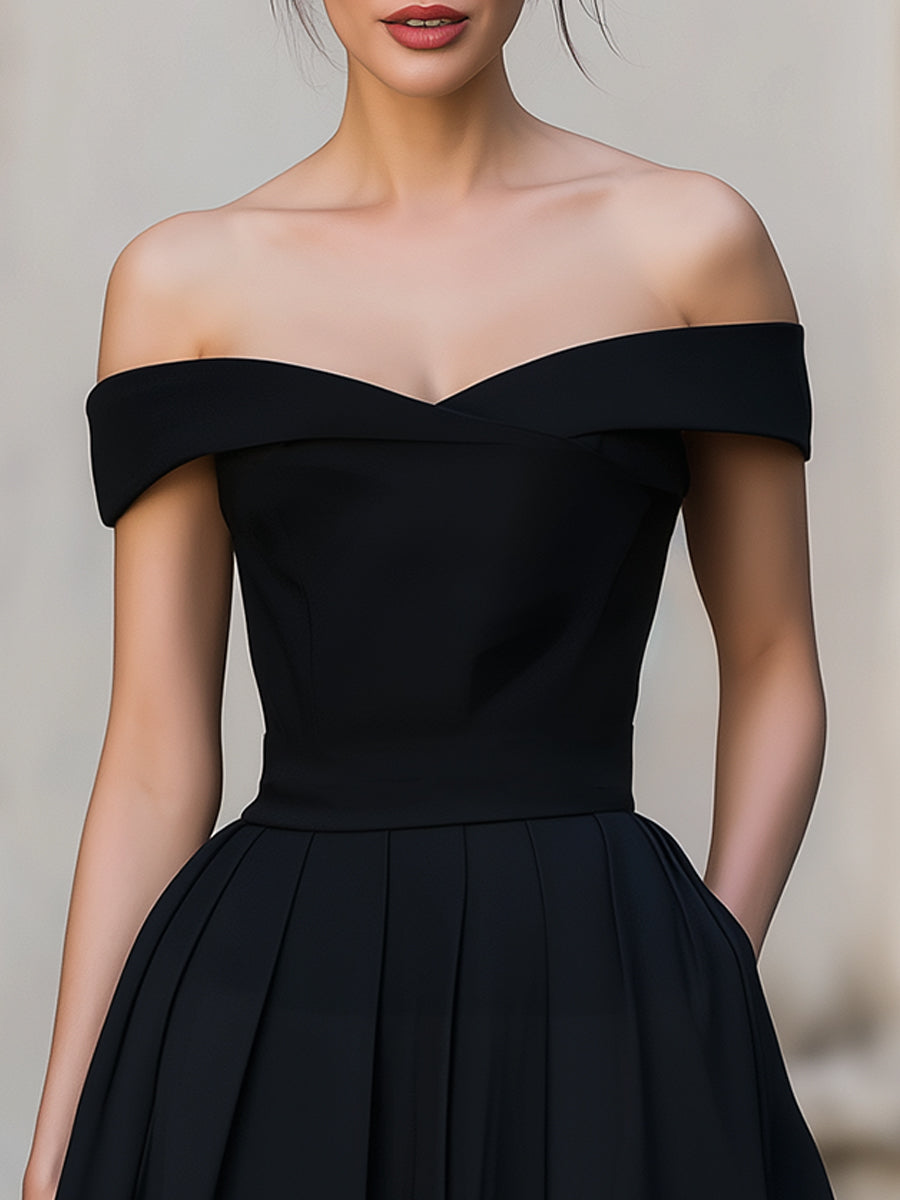 Crafted for the modern woman who embodies timeless elegance with playful sophistication, this black mini dress is a striking choice for premium evening and party occasions. It features a romantic off-shoulder sweetheart neckline with a structured folded band, a fitted bodice that sculpts the figure, and a full pleated A-line skirt with convenient side pockets. The deep black hue exudes understated allure, making it a standout staple for your event wardrobe.