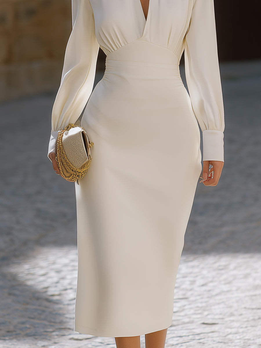 - Design: Choker neck detail with deep V neckline, softly gathered bust, high-waist seam, long sleeves with refined cuffs, clean pencil skirt construction