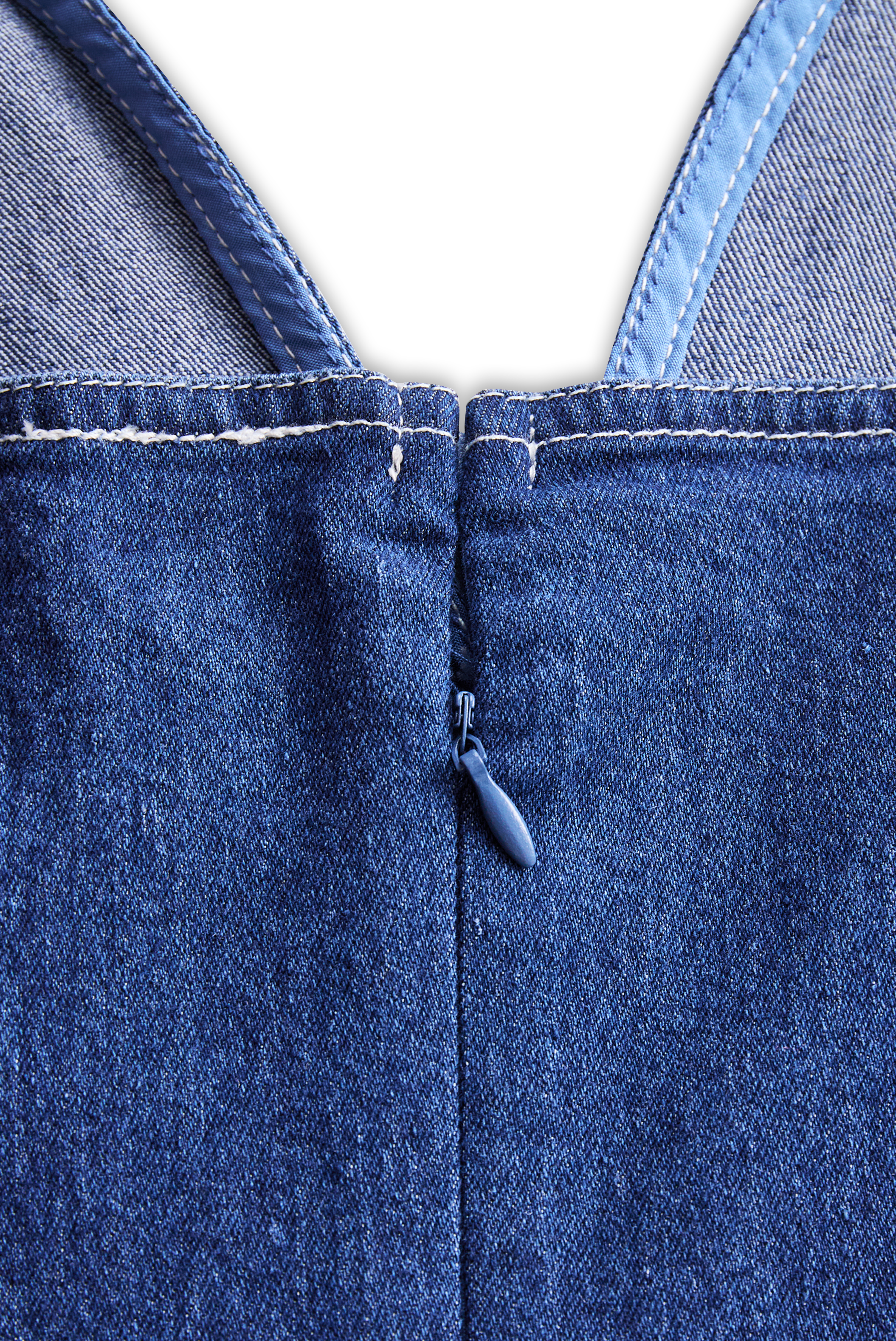 The figure-enhancing fit makes it a standout piece for summer dates, rooftop gatherings, or a confident day in the city.The premium denim fabric offers structure without sacrificing comfort, while visible stitching adds a tailored finish. Team it with strappy heels or chunky boots to create contrasting moods.