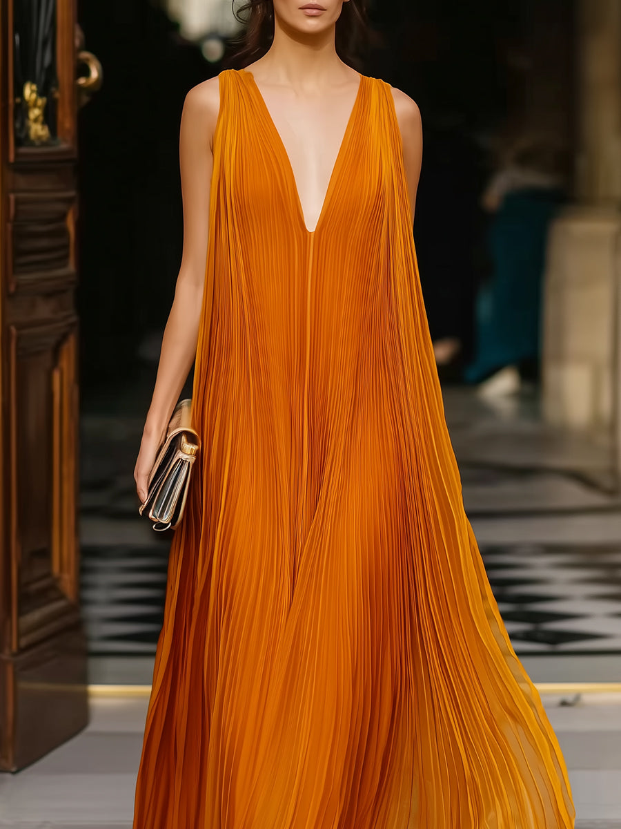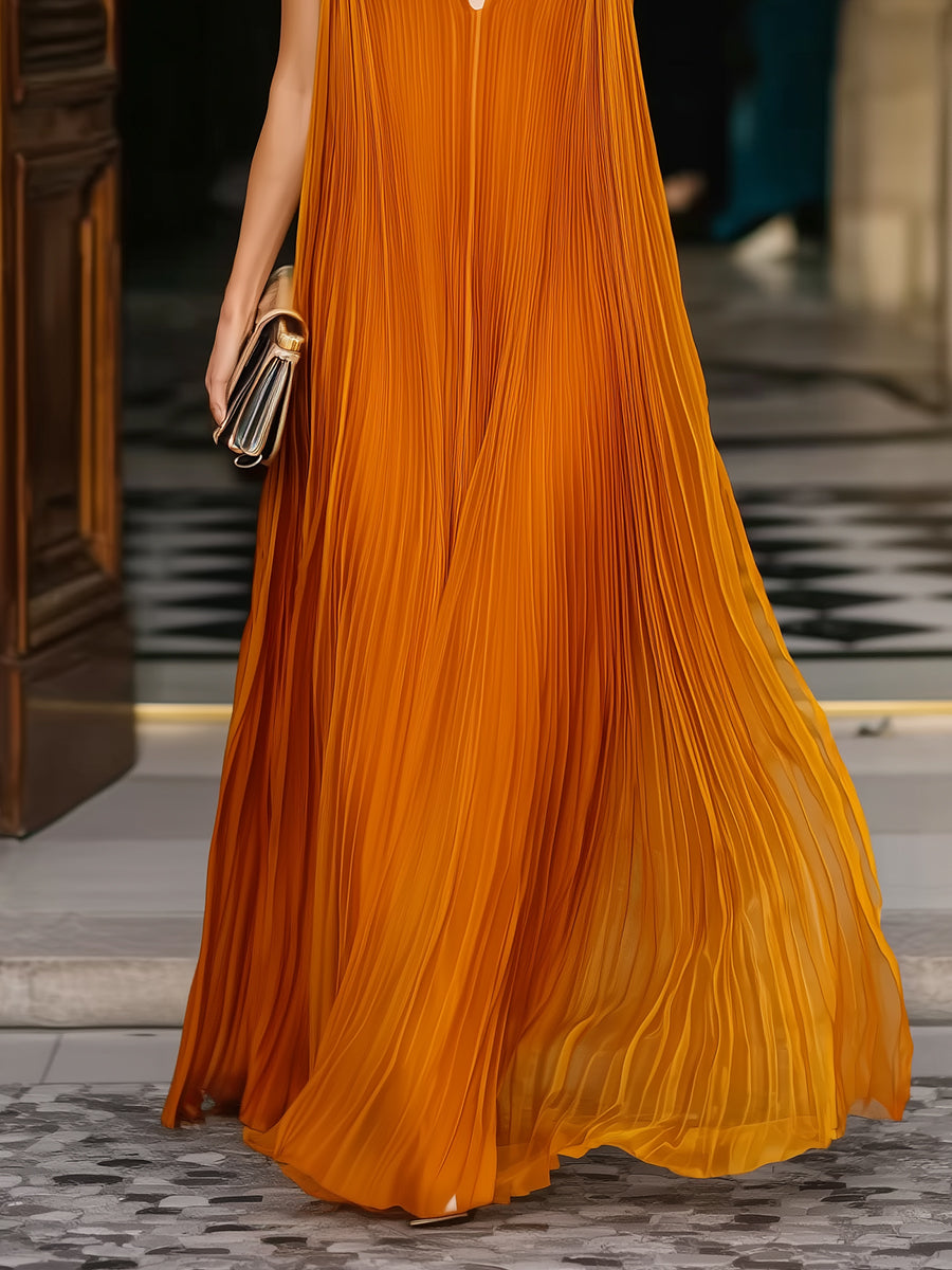 - Design: Deep V-neckline, sleeveless cut, fine all-over pleating, flowing full-length silhouette