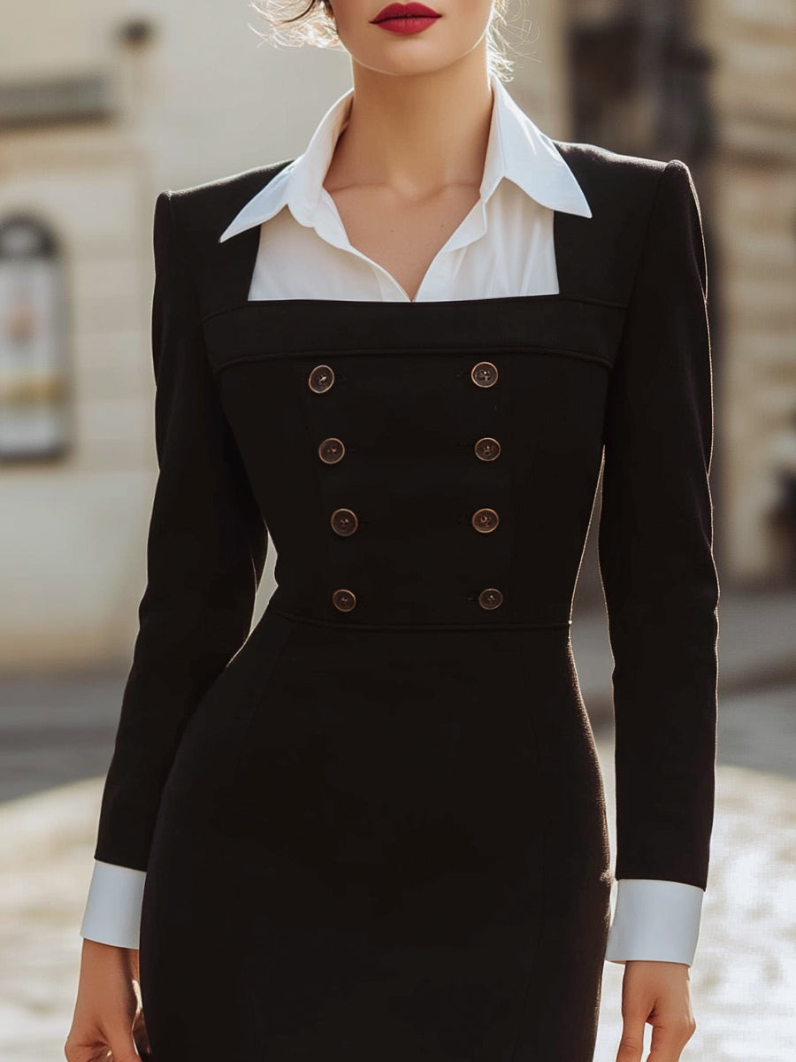 Elegant Faux-Layered Double-Breasted Slim Midi Dress