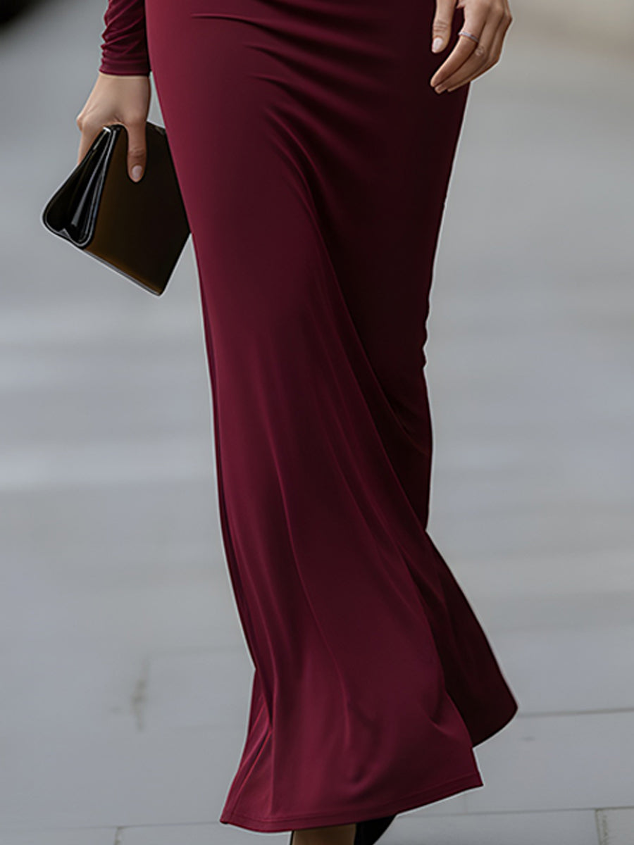 This Burgundy Long-Sleeve Draped Cutout Evening Gown blends sculptural elegance with modern sophistication, creating a breathtaking silhouette that is both dramatic and refined. Crafted from a smooth, figure-hugging stretch fabric, the gown contours the body with graceful fluidity, enhancing natural curves while offering comfortable movement.