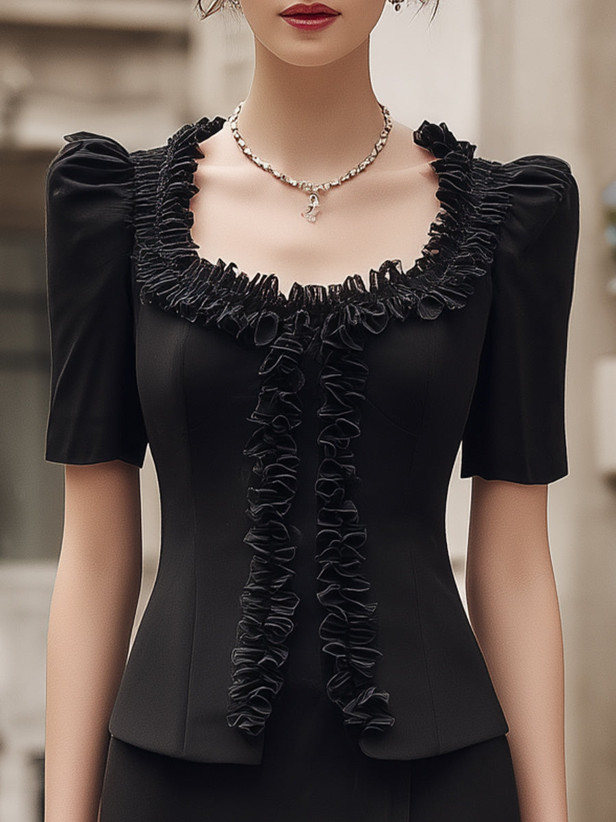 This elegant two-piece outfit combines vintage-inspired charm with modern sophistication, creating a graceful and refined look for special occasions. Featuring a beautifully tailored short-sleeve jacket layered over a feminine ruffled dress, this ensemble highlights delicate detailing while maintaining a polished and sophisticated silhouette.