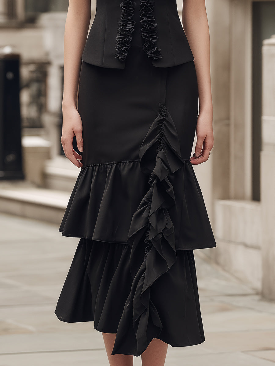 - Design: Short-sleeve ruffle-trim jacket paired with a fitted dress featuring cascading ruffle details and a mermaid-style skirt