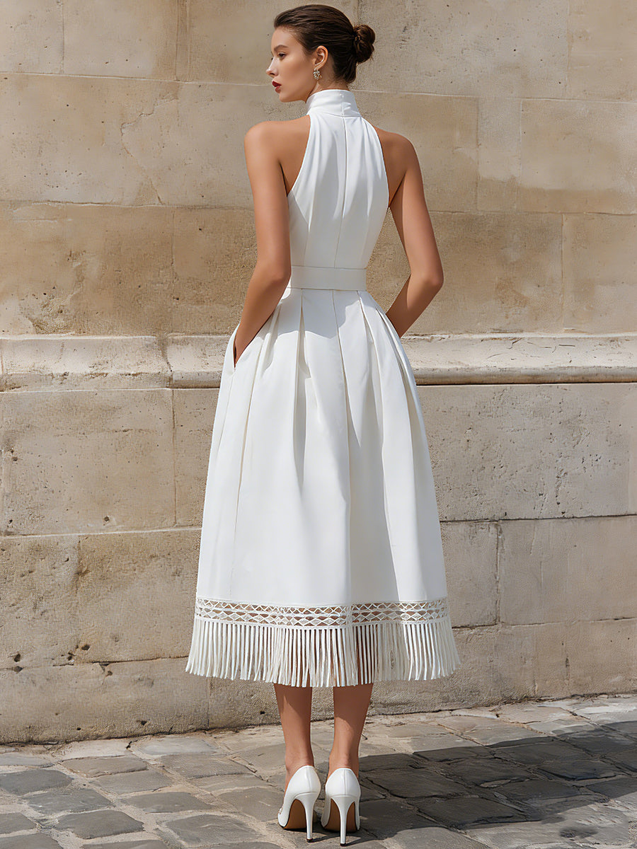 Ethereal High-Neck Halter Midi Dress With Lattice Fringe Hem
