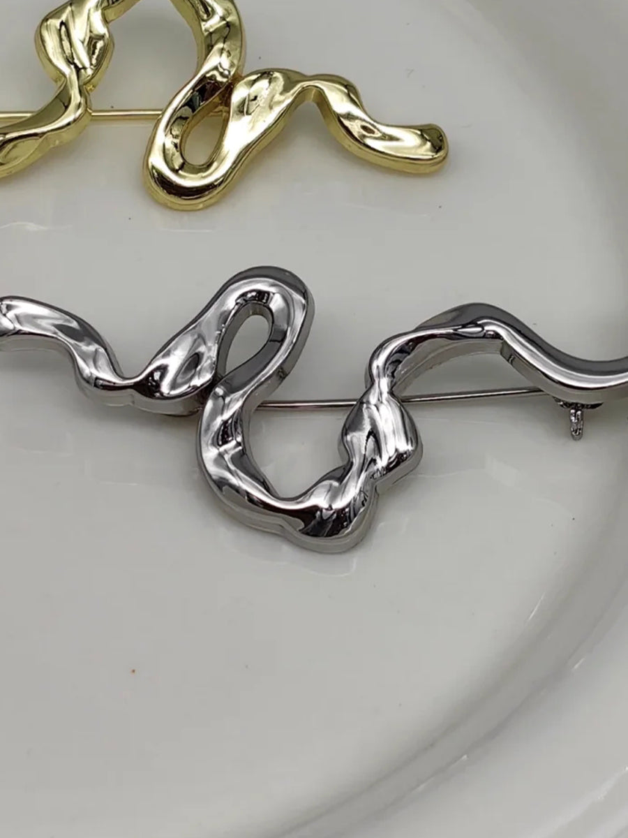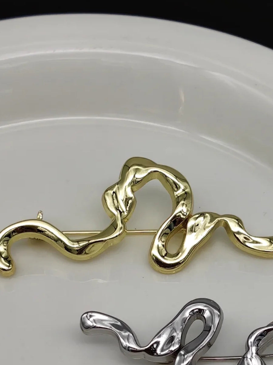 This Mooyius brooch showcases a graceful fluid-ribbon silhouette, designed for women who appreciate sculptural accessories with soft, modern movement. The piece features an organically curved form, reminiscent of flowing ribbon or abstract calligraphy. Available in both gold and silver finishes, it strikes a refined balance between contemporary art and understated luxury.
