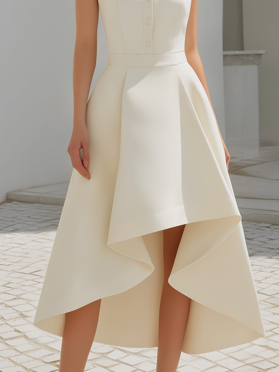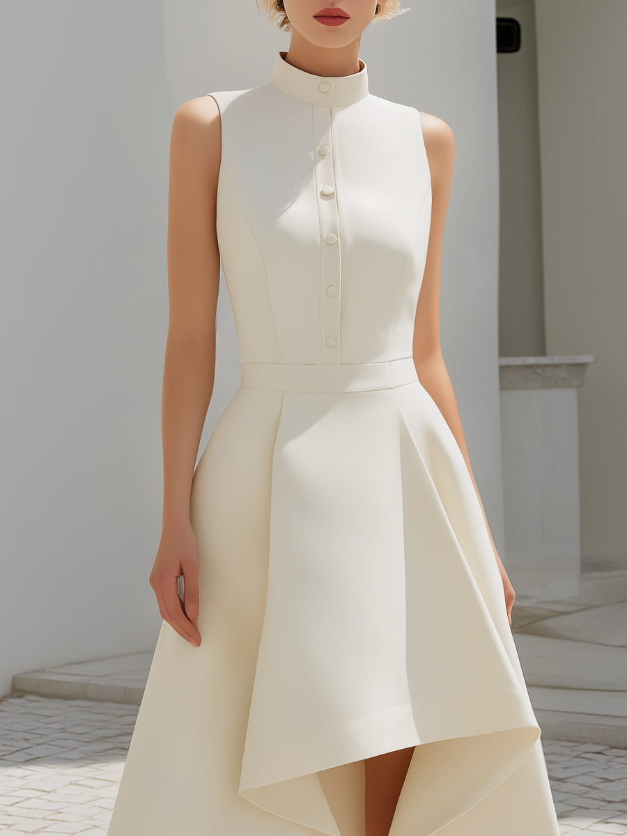 High-Neck Button Front Asymmetric Hem Midi Dress