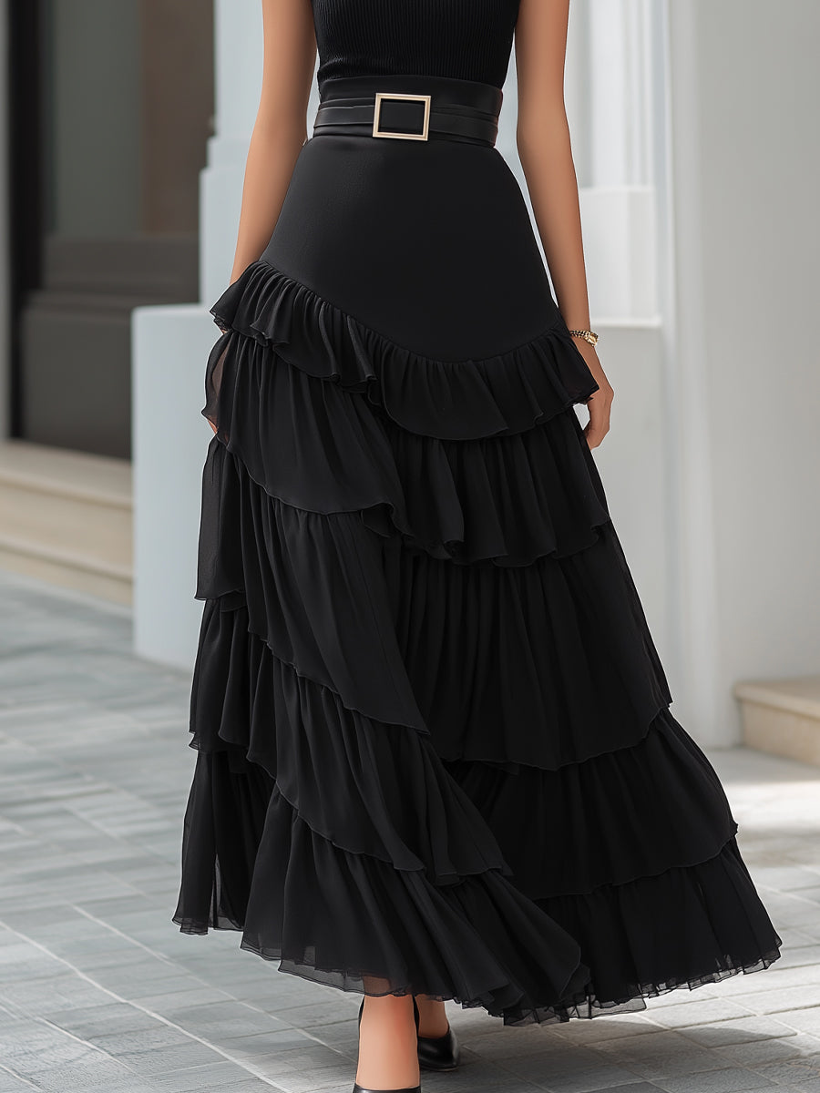 • Design: High-neck sleeveless knit top with subtle ruffle shoulders, paired with a high-waisted tiered ruffle maxi skirt and statement buckle detail