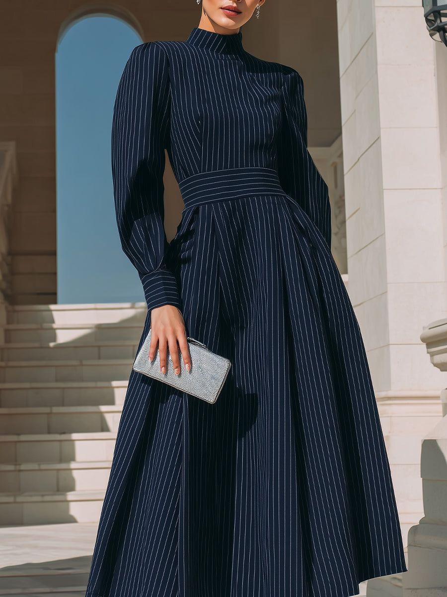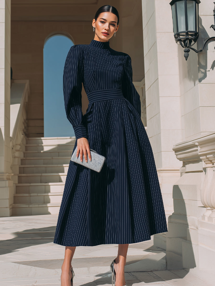 High-Neck Pinstripe Midi Dress With Structured Waist