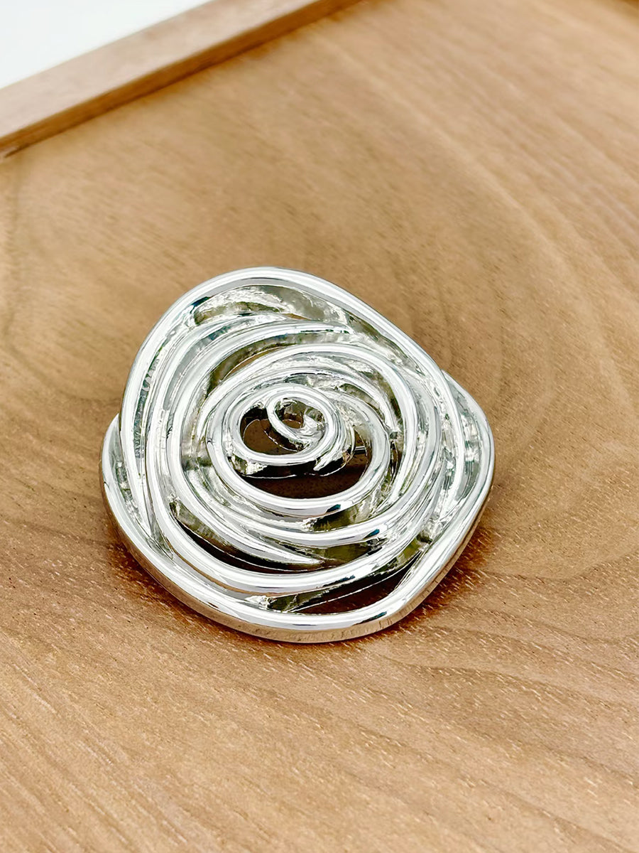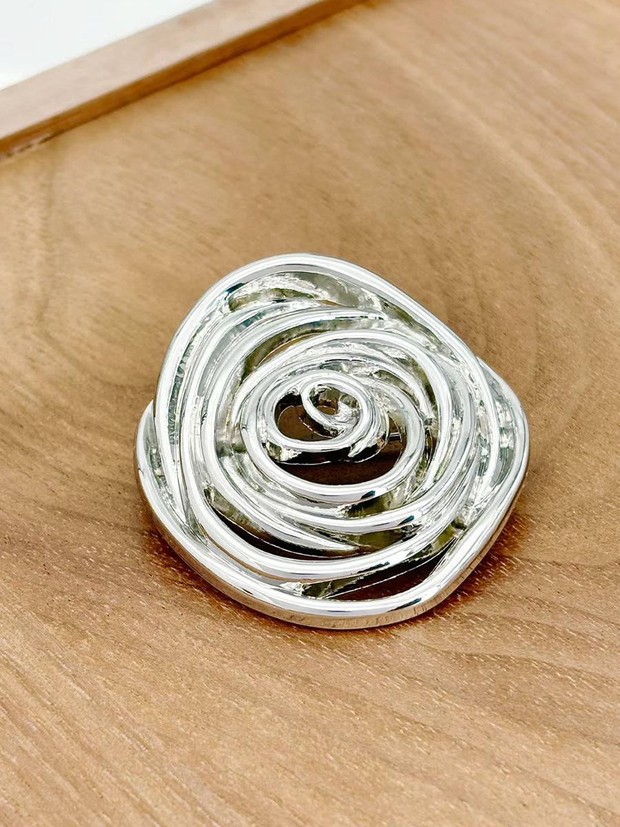 This contemporary spiral rose brooch reinterprets floral elegance through a sleek, sculptural lens. Crafted with a polished silver-tone finish, the piece forms a continuous swirling silhouette reminiscent of a blossoming rose, yet abstract enough to feel architectural and modern. Its fluid curves capture soft reflections of light, giving the accessory a glossy, high-fashion presence that enriches any ensemble with quiet sophistication.