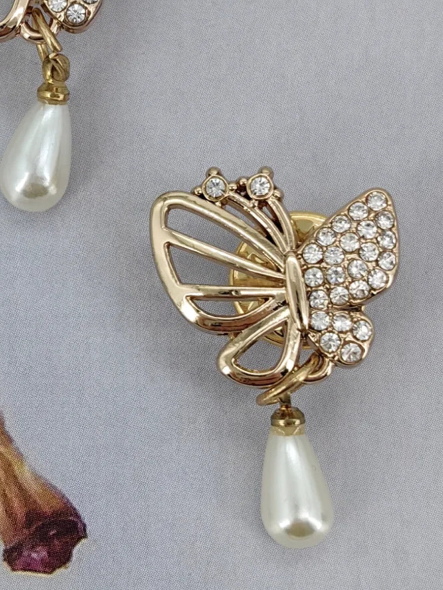 This Mooyius butterfly brooch captures the romance of vintage-inspired jewelry with its luminous pavé detailing and gracefully suspended pearl drop. The openwork wings create an airy silhouette, blending intricate structure with delicate sparkle. Rhinestones are thoughtfully arranged across the upper wing to deliver refined brilliance, allowing the brooch to shimmer beautifully in both natural light and evening settings.