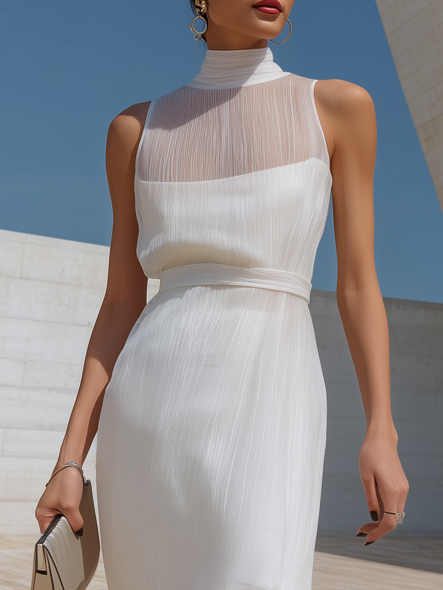 Crafted in lightweight chiffon featuring a refined vertical crinkle texture, the fabric introduces subtle dimension and graceful motion. The softly rippled surface enhances light reflection while maintaining an elegant, elongated profile. A high neckline creates a polished upper frame, while the sleeveless cut adds airy refinement ideal for warm-weather occasions.