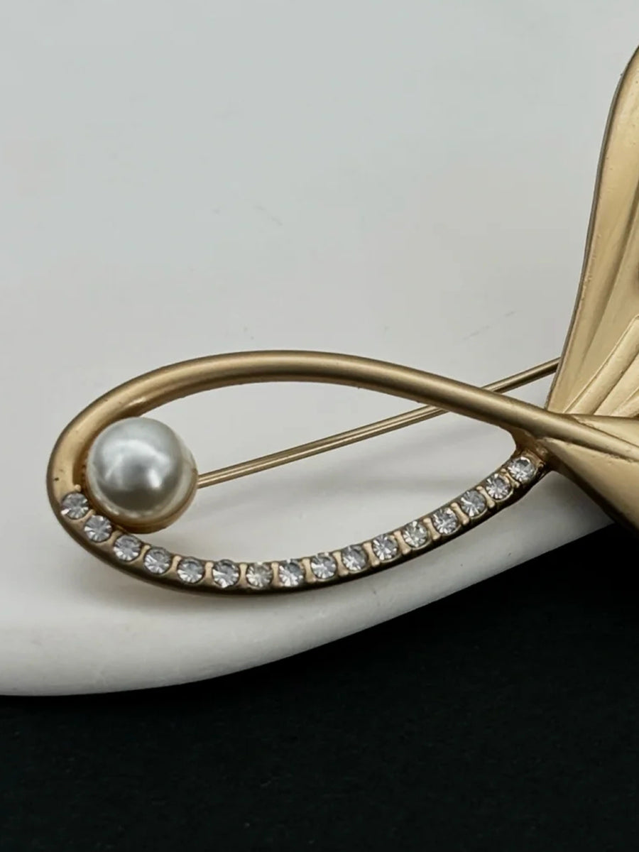 The brooch features a soft brushed-metal finish that mimics botanical texture, allowing it to catch and reflect light in a subtle, luxurious way. A row of small rhinestones along the curved arc adds just the right amount of sparkle—never overwhelming, always elegant. Whether worn on a blazer lapel, a cashmere coat, a silk dress, or a structured shirt, this piece instantly adds character and poise.