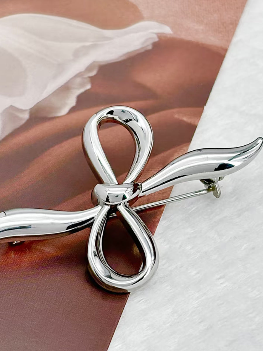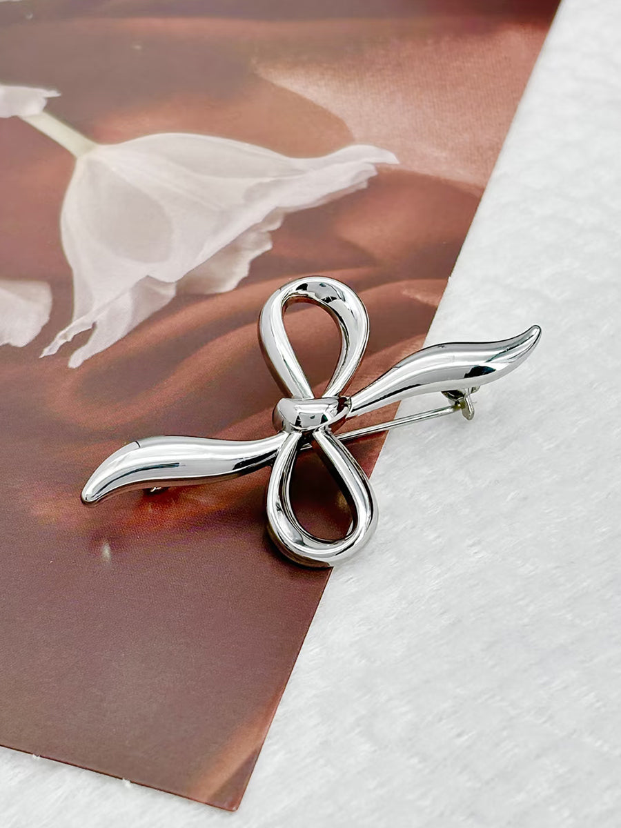 Crafted with a high-shine metallic finish, the brooch reflects light beautifully from every angle, highlighting its sculptural contours and soft, flowing lines. The design features two elongated loops that form an abstract bow, complemented by tapering ends that extend outward with effortless sophistication. This harmonious balance of curves and clean surfaces makes the piece visually striking without overwhelming your outfit.