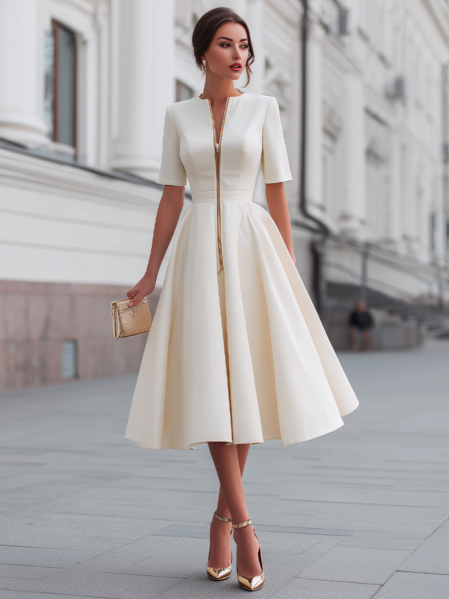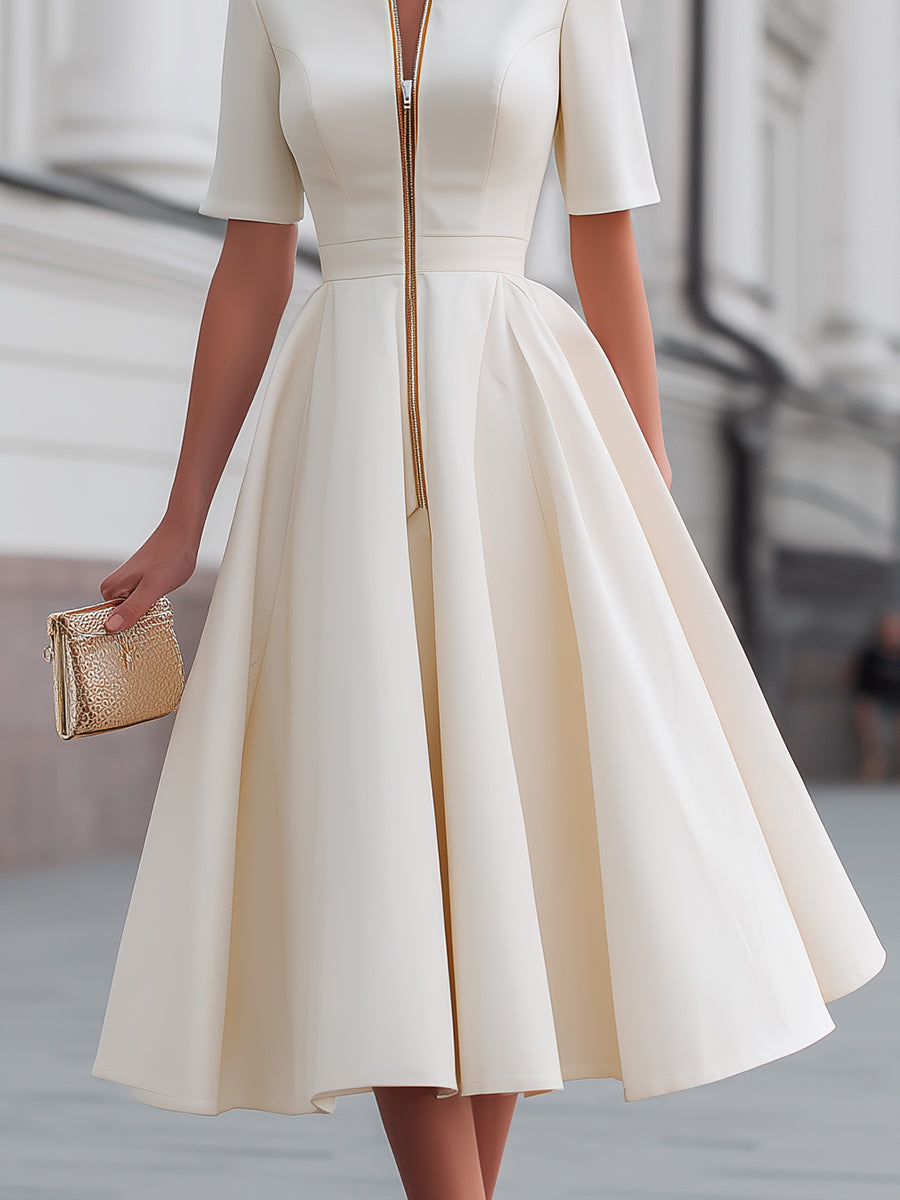 Mooyius presents a refined midi dress that blends modern tailoring with timeless feminine elegance. This short-sleeve design features a clean structured neckline accented by a sleek front zipper detail, introducing a contemporary edge while maintaining polished sophistication. The tailored bodice gently contours the upper body, highlighting the waist with precise shaping before flowing into a voluminous fit-and-flare skirt. Soft pleating adds graceful movement and balanced proportions, creating an effortlessly elegant silhouette designed for confident modern dressing. The minimalist structure allows the craftsmanship and silhouette to stand out, making this dress a versatile statement piece suitable for both professional and refined social occasions.