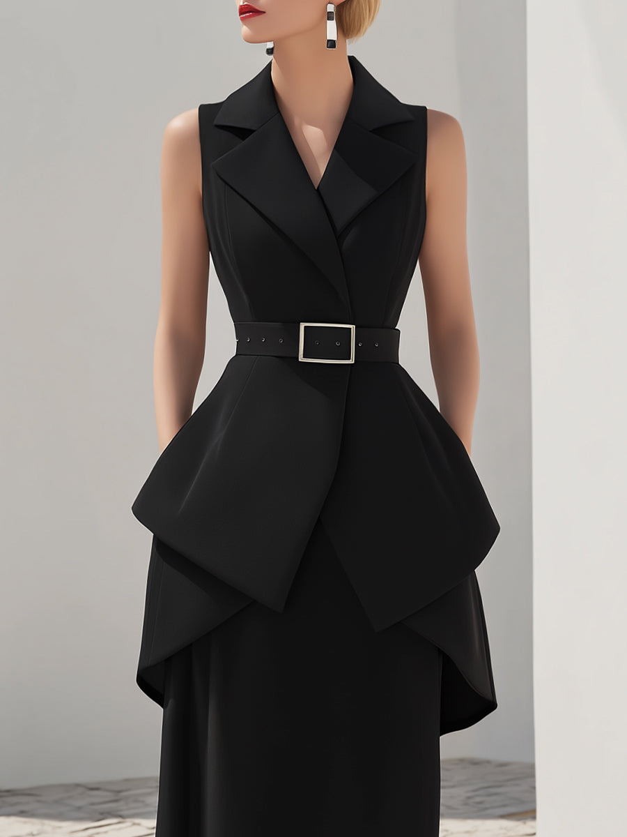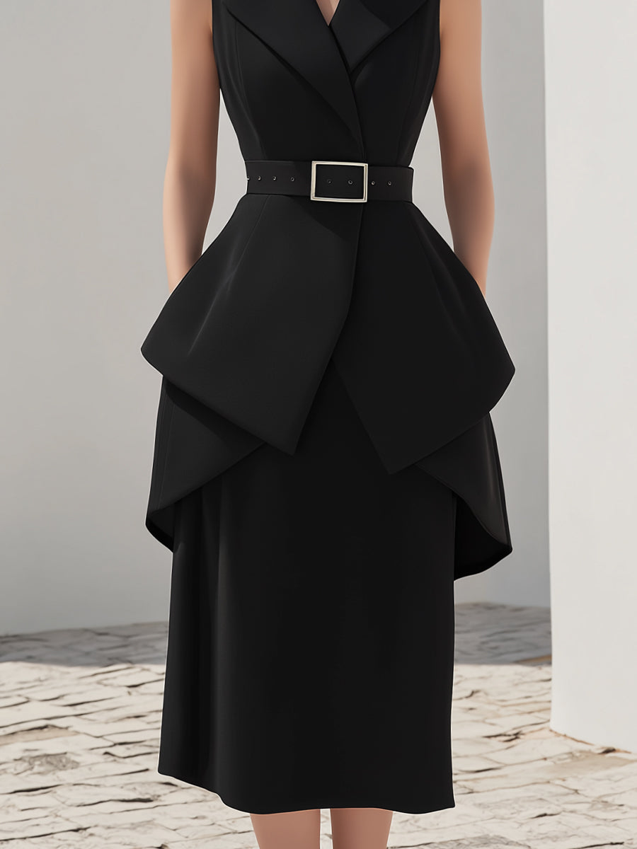 - Design:Sleeveless vest with oversized lapel, belted waist, sculptural layered hem, paired with a sleek midi skirt
