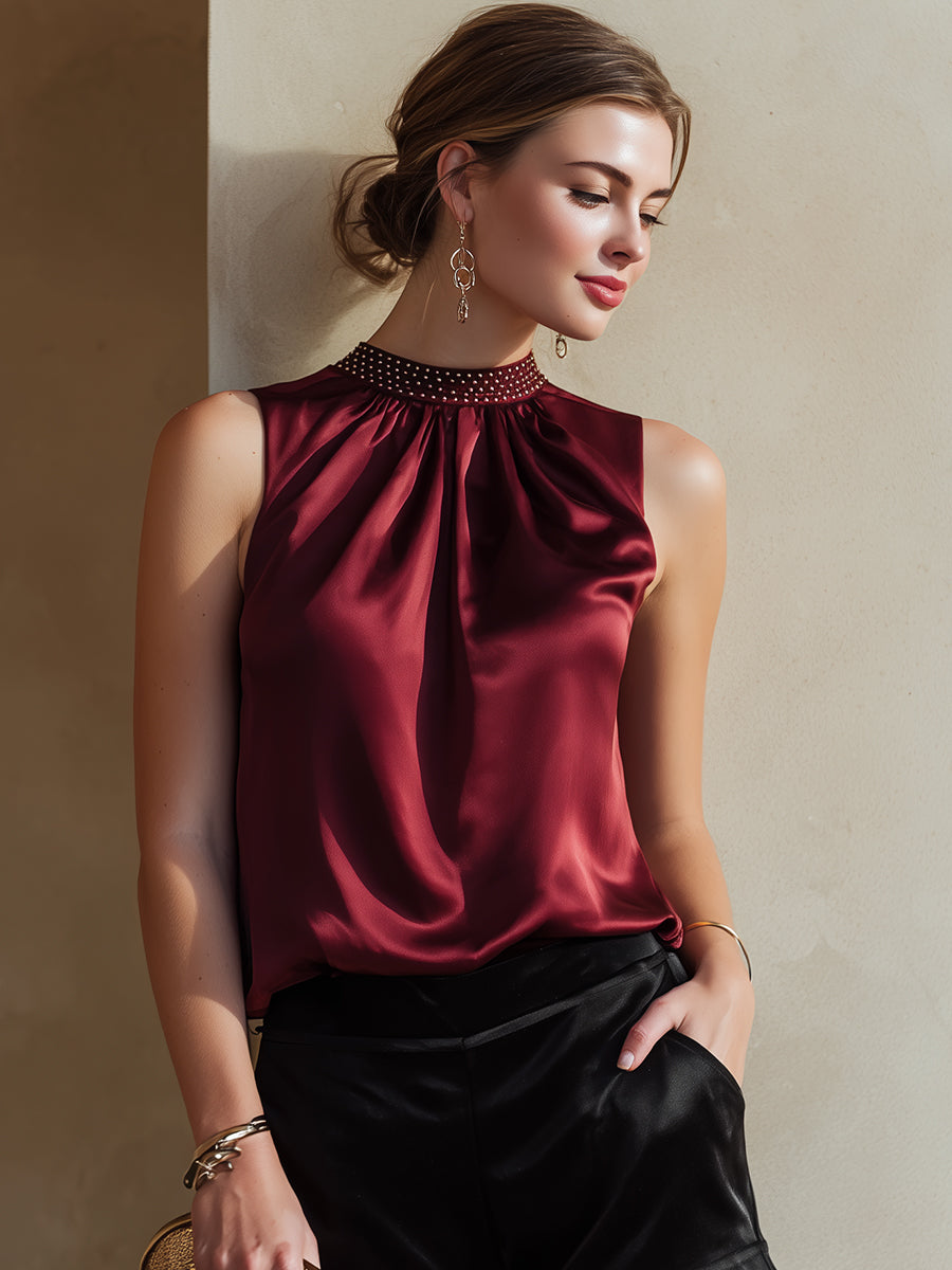 Sleeveless Wine Satin Top With Embellished Mock Neck