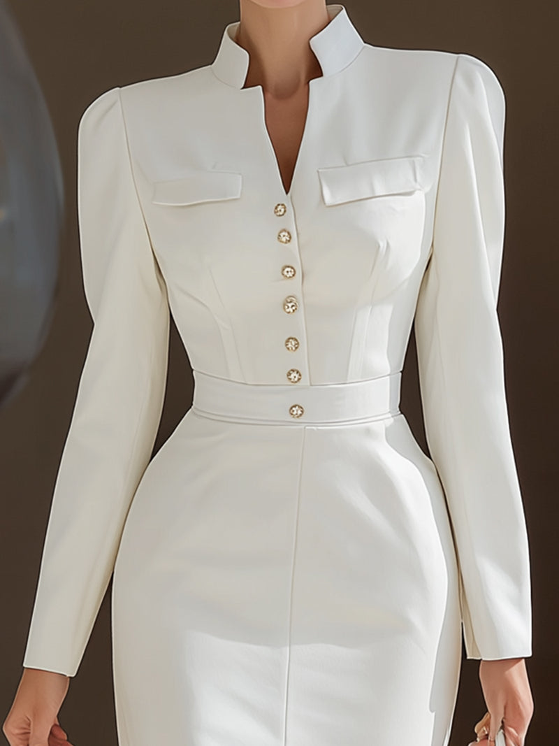 Elegant White Tailored Midi Dress With Gold Buttons