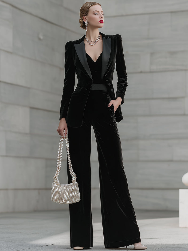 Black Velvet Tailored Blazer And Wide-Leg Trouser Suit Set