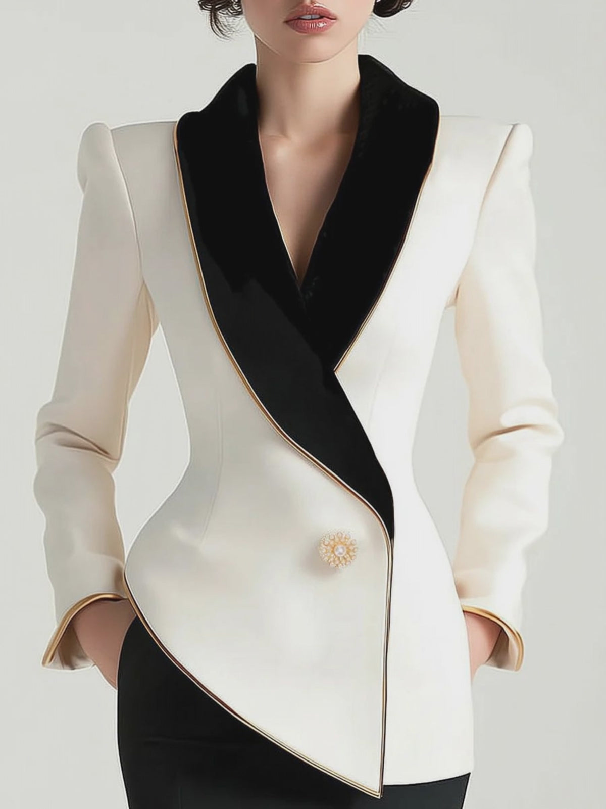 Elegant Asymmetrical White Blazer with Black Contrast Lapels