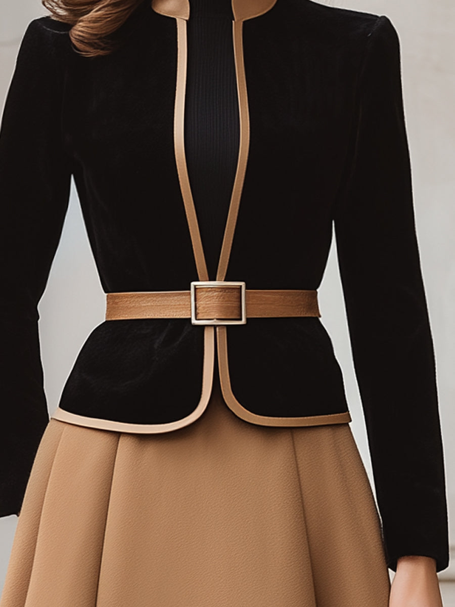 Two-Tone Trim Belted Velvet Blazer