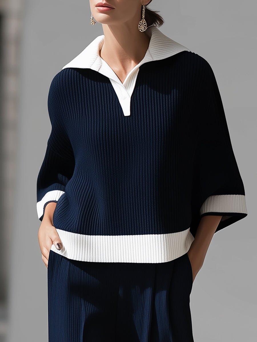 Elevate your daily wardrobe with this elegant navy and white ensemble. This set features an oversized, wide-sleeved polo sweater with a striking contrast collar and hem, paired with matching wide-leg trousers.