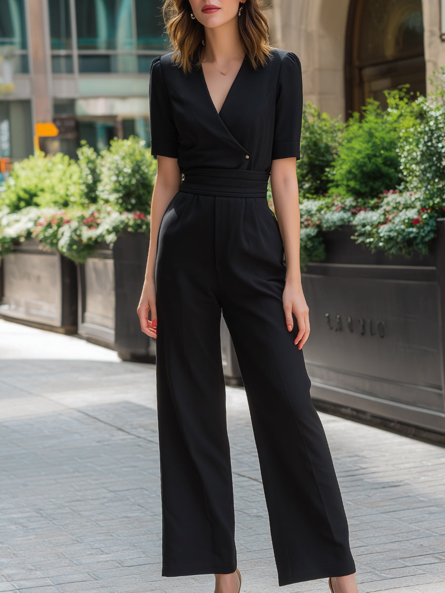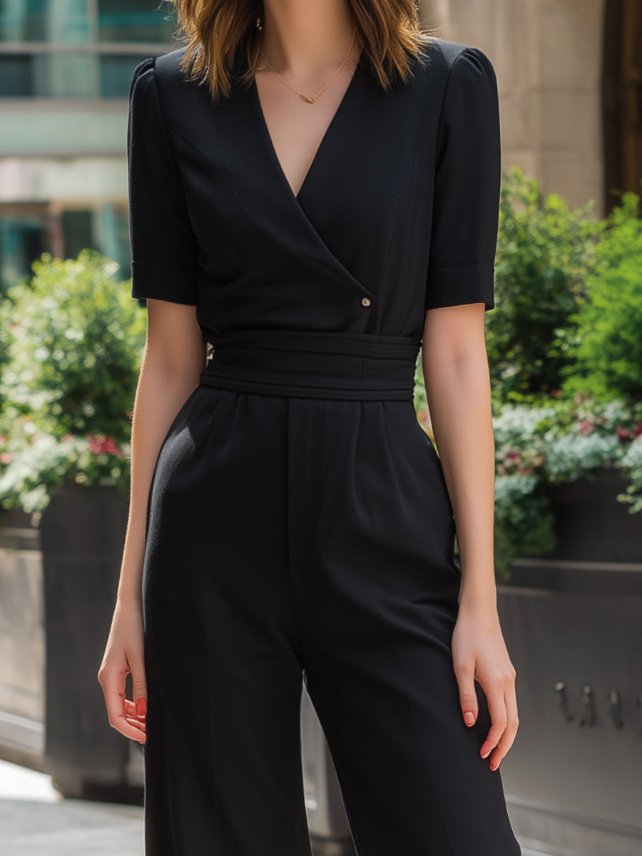 This short-sleeve wrap-front jumpsuit delivers a refined yet effortlessly wearable look, perfect for women who appreciate structured minimalism with contemporary charm. The softly tailored bodice features a clean V-neckline and subtle wrap detailing that enhances the natural curves while maintaining an elegant, streamlined appearance. The short sleeves offer a refreshing balance—polished enough for professional use yet comfortable for warm-weather styling.