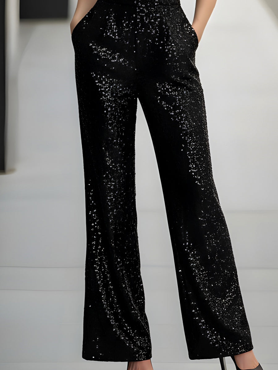 Cross-Neck Sequin Elegance Wide-Leg Jumpsuit