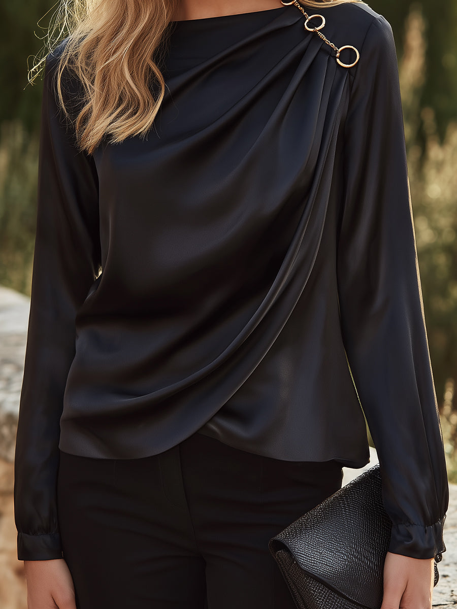• Design: Asymmetric draped front, softly gathered neckline, long sleeves with tailored cuffs, and gold-tone ring detailing at the shoulder