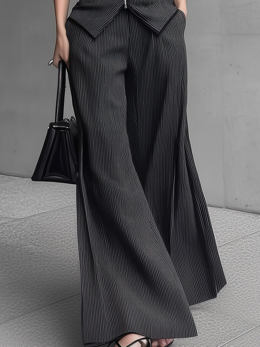 Pinstripe Sleeveless High-Collar Top And Wide-Leg Trouser Suit Set