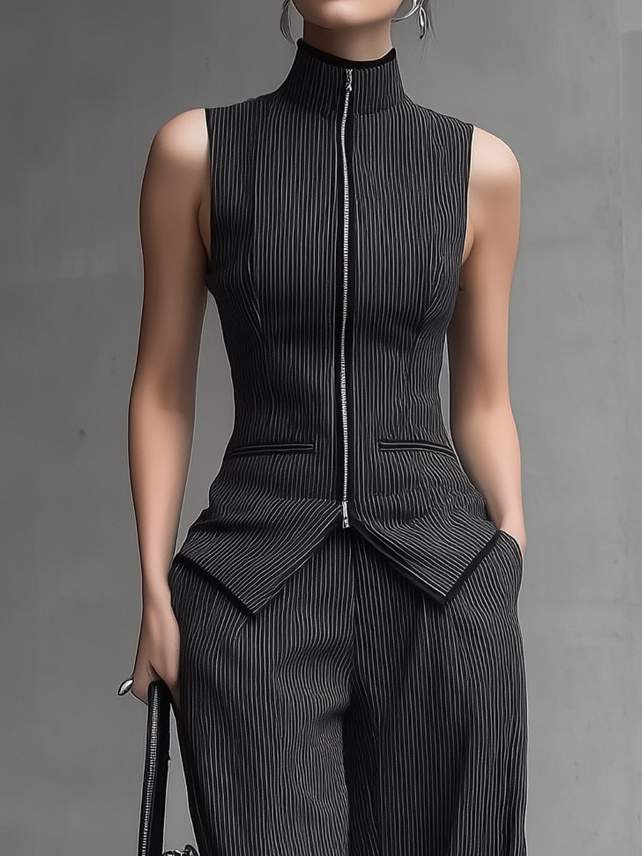The top features a structured high collar and a sleek front zipper that creates a sharp vertical line, enhancing the neckline and elongating the upper body. The sleeveless cut adds modern edge while allowing natural movement, making the piece both striking and comfortable. Subtle contouring at the waist, combined with the directional pinstripe pattern, sculpts a flattering silhouette that feels strong yet feminine. The pointed hemline at the front mimics tailored suiting elements, adding precision and visual interest.
