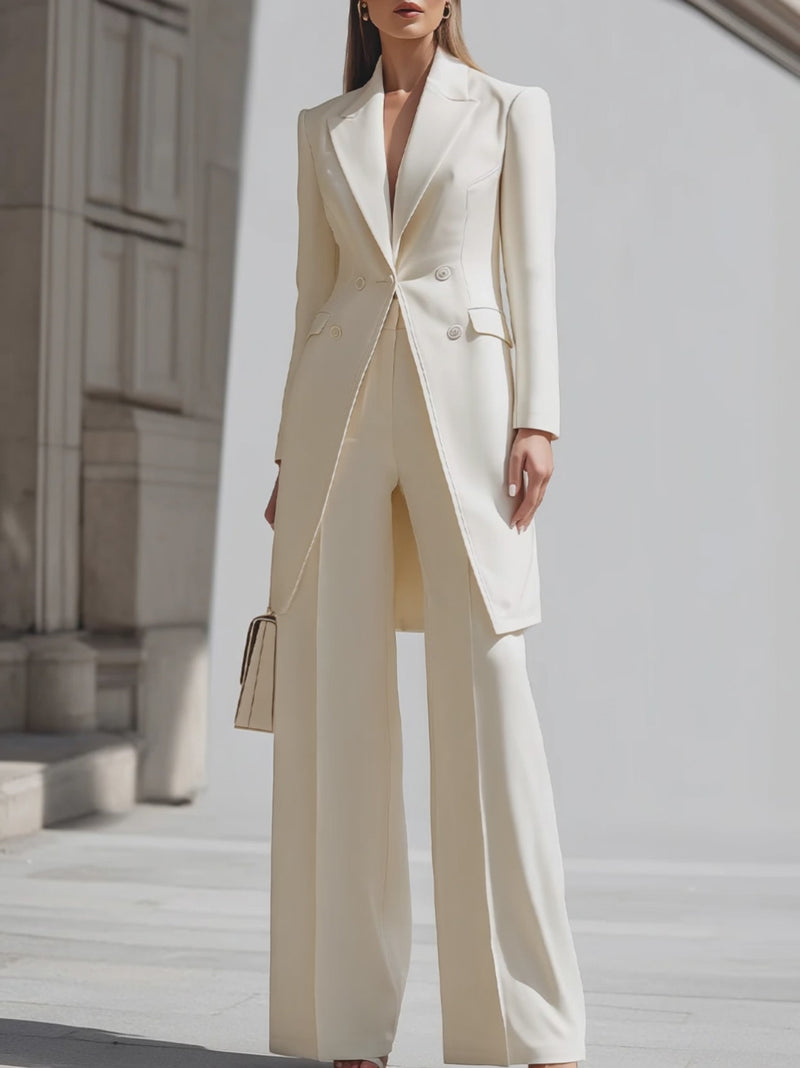 Elegant Cream Longline Blazer And Wide - Leg Pants Set